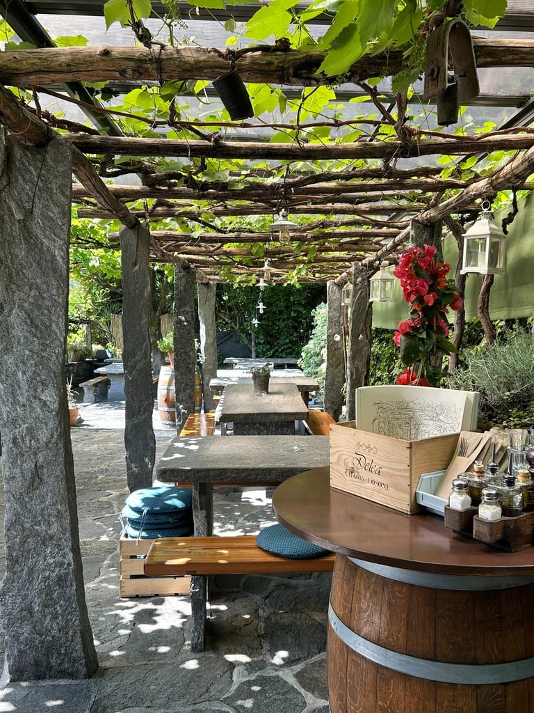 Die Atmosphäre ist rustikal und stimmungsvoll – der Innenraum verfügt über einen Kamin, der eine warme und einladende Stimmung wie zu Hause schafft. Die Außenterrasse unter dem Weinpergola ist ruhig und abgeschieden, abseits des Verkehrs der Hauptstraße, aber dennoch leicht erreichbar: entweder mit dem Auto von den Parkplätzen unterhalb des Grottos oder zu Fuß vom alten Dorfkern aus. Ein idealer Ort, um angenehme Stunden in Gesellschaft des Partners, mit der Familie oder Freunden zu verbringen.
