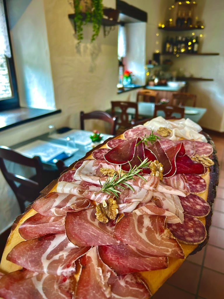 Die Atmosphäre ist rustikal und stimmungsvoll – der Innenraum verfügt über einen Kamin, der eine warme und einladende Stimmung wie zu Hause schafft. Die Außenterrasse unter dem Weinpergola ist ruhig und abgeschieden, abseits des Verkehrs der Hauptstraße, aber dennoch leicht erreichbar: entweder mit dem Auto von den Parkplätzen unterhalb des Grottos oder zu Fuß vom alten Dorfkern aus. Ein idealer Ort, um angenehme Stunden in Gesellschaft des Partners, mit der Familie oder Freunden zu verbringen.